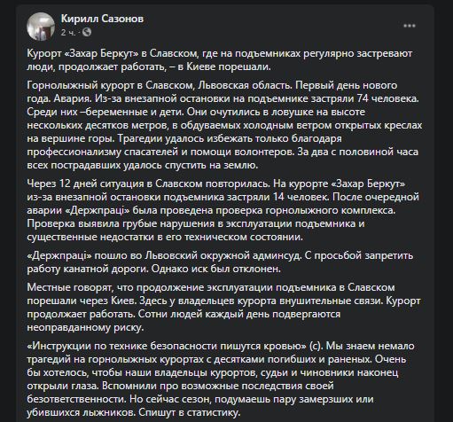 "Местные говорят, что продолжение эксплуатации подъемника в Славском порешали через Киев. Здесь у владельцев курорта значительные связи. Курорт продолжает работать. Сотни людей ежедневно подвергаются неоправданному риску", - пишет эксперт.