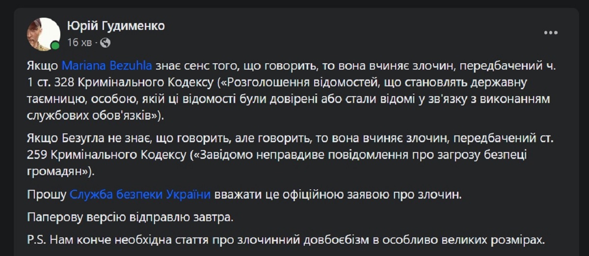 Ветеран саперных войск Вооруженных сил и политический деятель Юрий Гудименко указал на признаки двух тяжких уголовных преступлений в заявлении Марьяны Безуглой и обратился в СБУ.