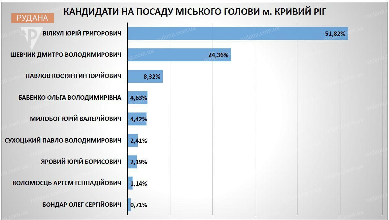 Ближайший соперник Вилкула Дмитрий Шевчик набирает 24,4% голосов избирателей, на третьем месте Константин Павлов - 8,32%.