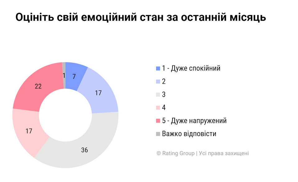 До войны, в 2020-2021 годах, эмоциональное состояние граждан колебалось. В начале коронавирусной пандемии украинцы чаще ощущали покой (44%), чем напряжение (23%). В 2020 году напряжение ощущали 33% опрошенных.