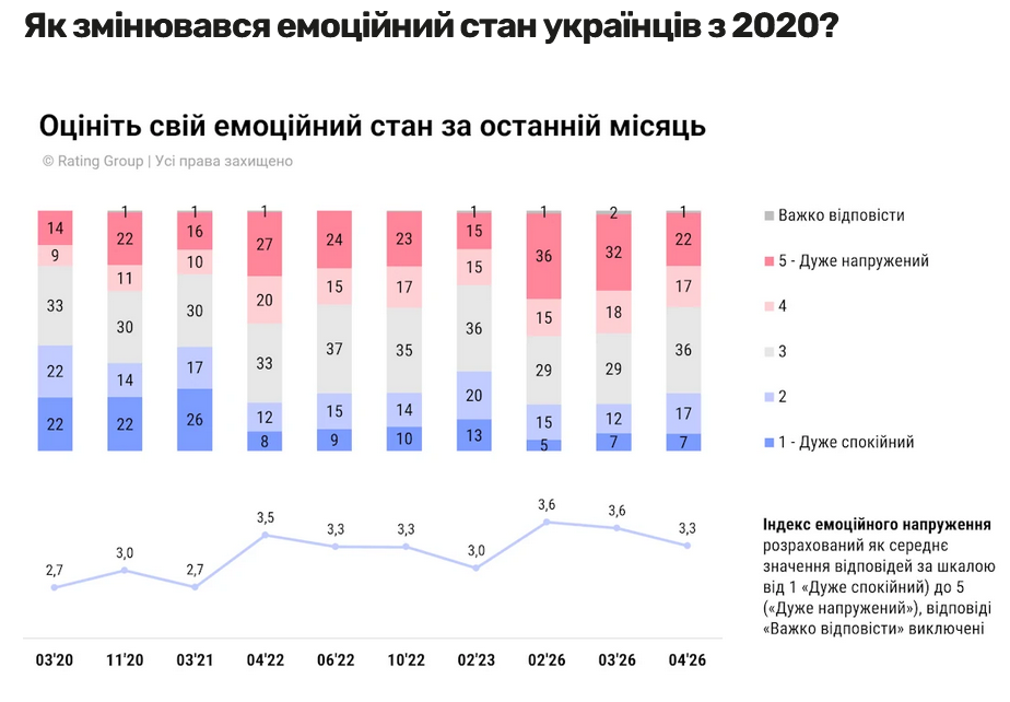 Во время сложной зимы-2026 в условиях массированных атак РФ на критическую инфраструктуру, перебоев в электроэнергии и тепла украинцы испытывали пик эмоционального напряжения с 2020 года (51%). Эта доля превысила даже показатель апреля 2022-го.