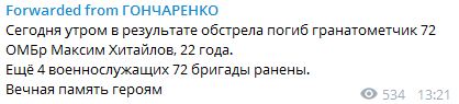 Утром,18 февраля, в результате обстрела погиб гранатометчик 72 ОМБр Максим Хитайлов. Ему было всего 22 года.
