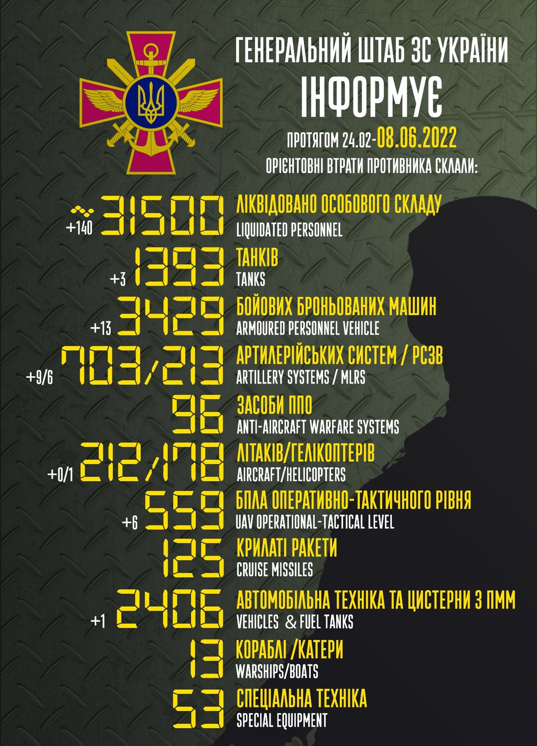 Об общих боевых потерях врага на 8 июня сообщают в Генштабе ВСУ.