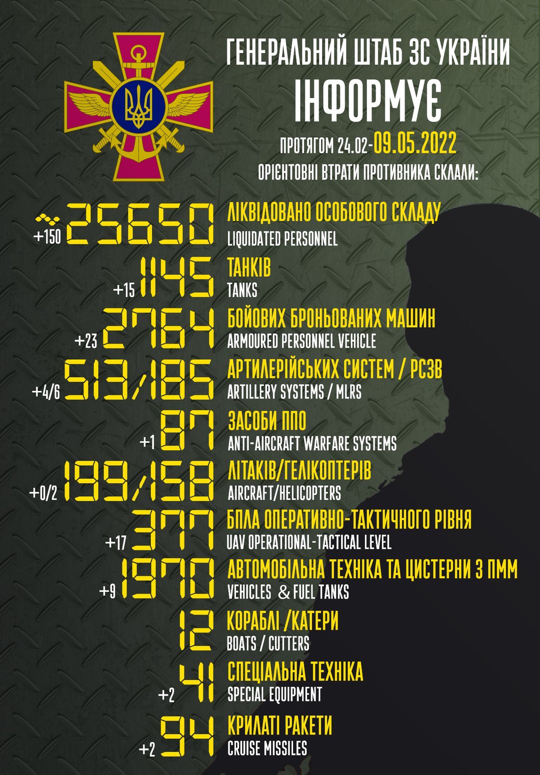 Ориентировочные потери российского оккупационного войска по состоянию на 9 мая: