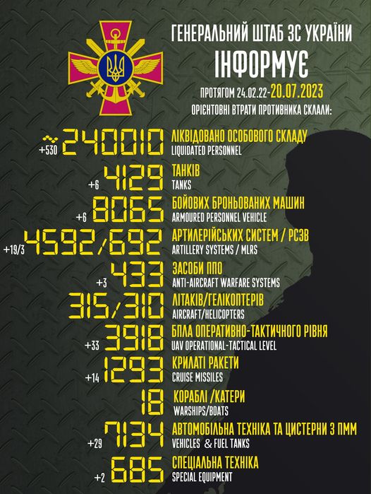 Оккупанты продолжают нести большие потери в Украине. По состоянию на 20 июля 2023 года ВСУ уничтожили в общей сложности более 240 тысяч окупантов.