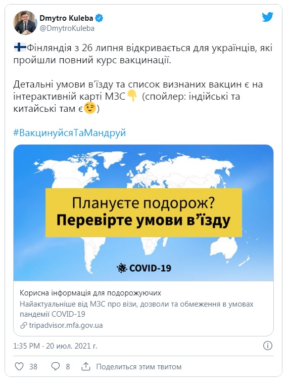 Так, уже с 26 июля Финляндия откроет границы для вакцинированных граждан Украины.