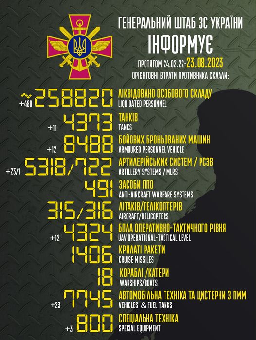 Общие боевые потери противника с 24.02.22 по 23.08.23 ориентировочно составили: