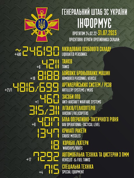 Общие боевые потери противника с 24.02.22 по 31.07.23 ориентировочно составили: