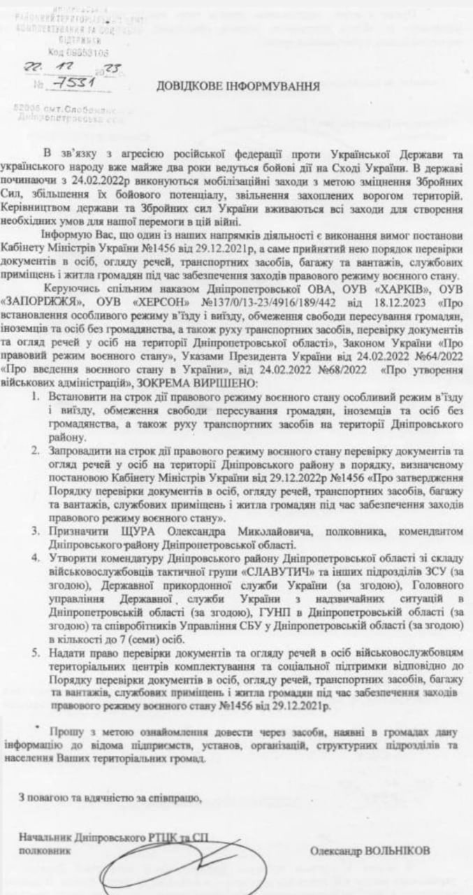 Как отмечается на сайте Синельниковского горсовета, на территории района создана комендатура, руководителем которой назначили начальника Синельниковского районного Терцентра комплектования и соцподдержки Евгения Шкная.