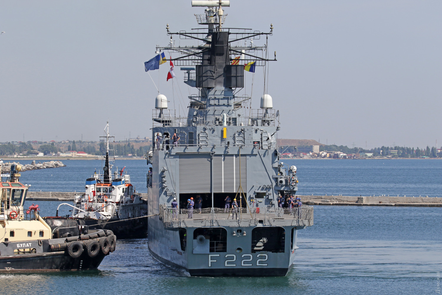 Первыми, около 7:00, пришвартовались в военно-морской базе "Юг", что в Практической гавани, корветы - румынский "Контр-адмирал Себастиан" (борт 264) и болгарский "Бодрый" (борт 14).