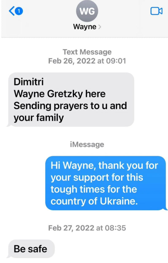 Пасховер отмечает, что на второй день полномасштабного вторжения Уэйн Грецки, звезда канадского хоккея, прислал смс-сообщение своему бывшему одноклубнику и теперь главному тренеру сборной Украины по хоккею Дмитрию Христичу. В этом сообщении Грецки написал, что молится о Христиче и его семье.