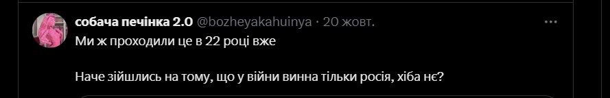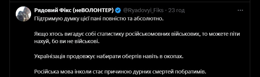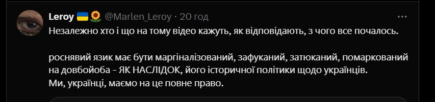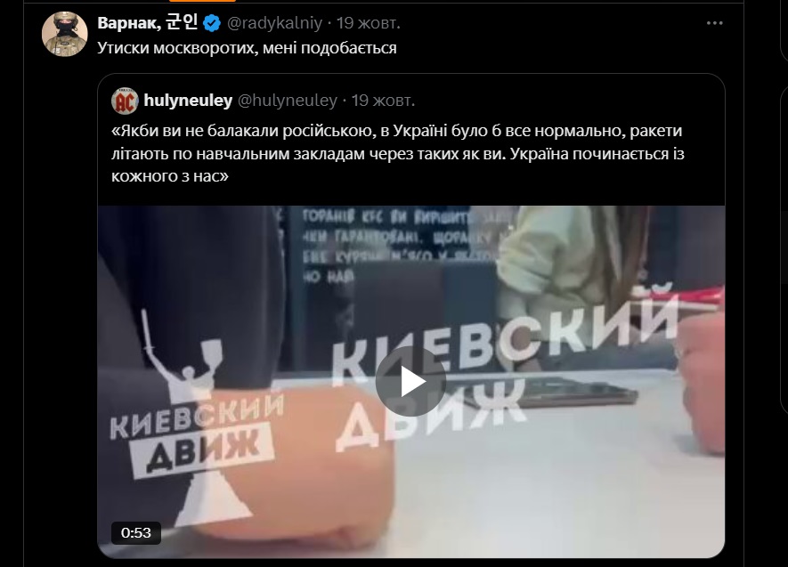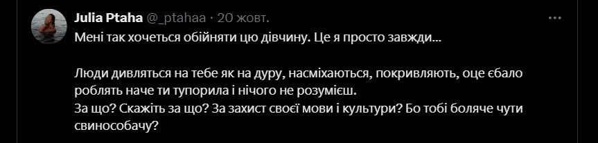 "Если бы вы не говорили по-русски, в Украине было бы все нормально, ракеты летают по учебным заведениям из-за таких, как вы. Украина начинается с каждого из нас", – процитировал автор твита девушку.