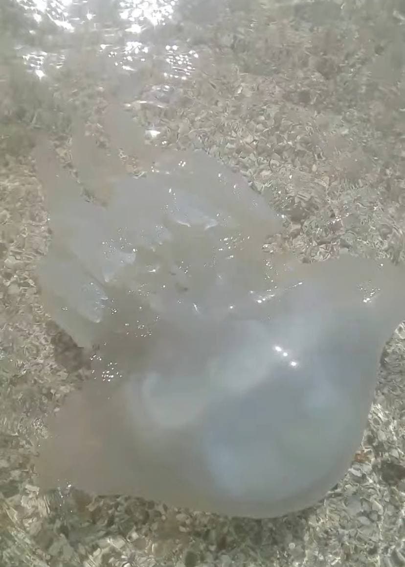 "Погода хорошая. Водичка чистая. Но тут у нас такие огромные медузы. Щупальцы видные. Они жалят. Но люди купаются, не боятся… Желательно намазаться кремом, тогда они не так будут жалить", - говорит девушка.