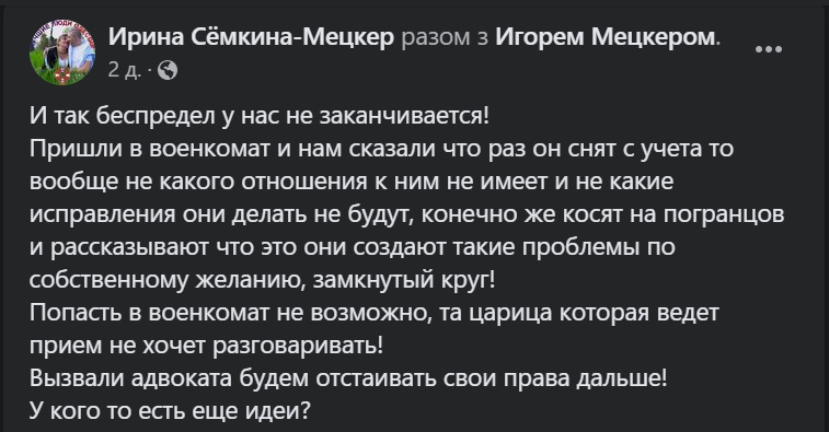Далее Ирина заявила, что идет с мужем и адвокатом в ТЦК для получения официального объяснения. Но даже в ТЦК с ними не захотели разговаривать: мол, "снят с учета - значит, к нам никаких вопросов, обращайтесь к пограничникам". Женщина назвала ситуацию "замкнутым кругом".