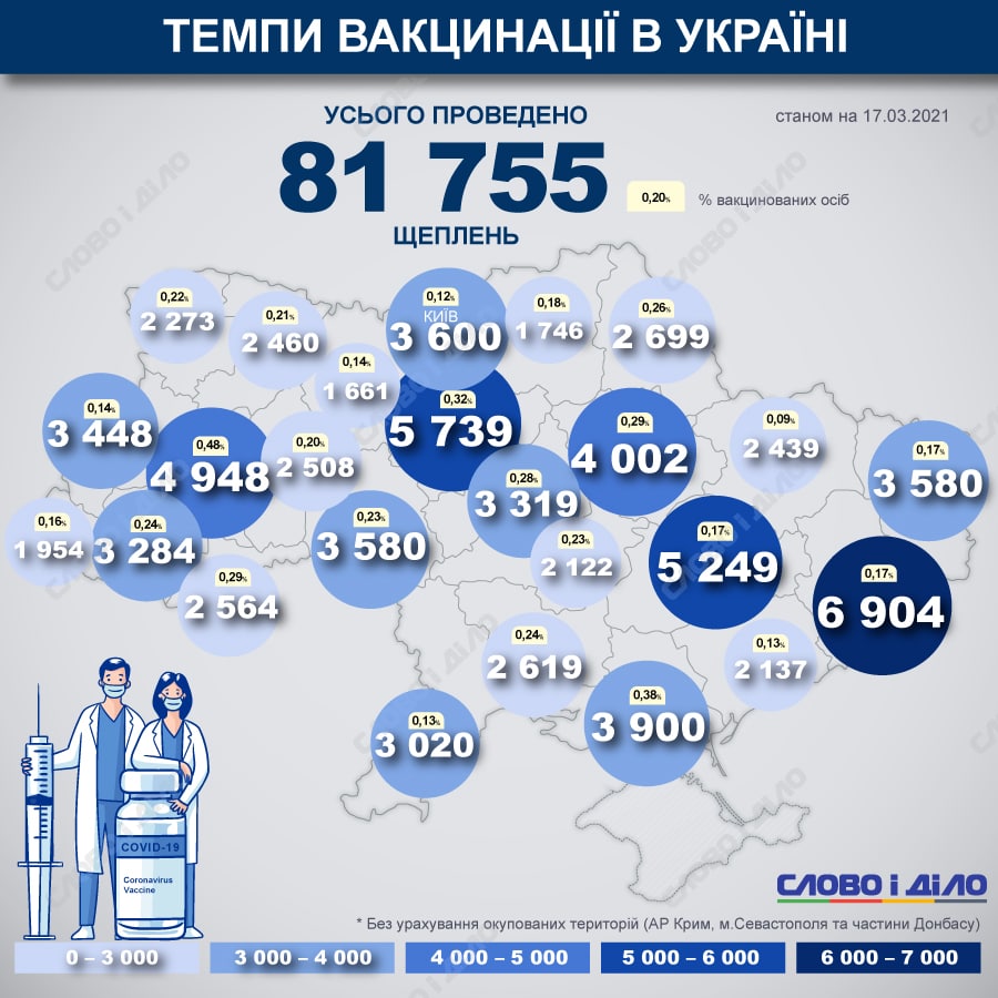Как пишет издание "Слово и Дело", по состоянию на 17 марта в Украине сделано 81 755 прививок препаратом CoviShield. Меньше всего вакцинаций проведено в Харьковской области - там только 0,09% граждан получили прививки.