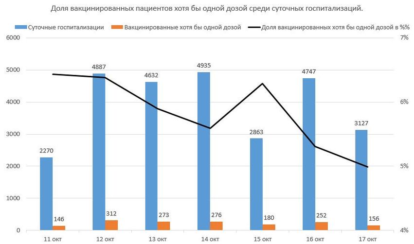 "Данные доступны только с 11 октября, имеем для расчета всего 8 дней. За 8 дней были госпитализированы 27 461 пациент, из них 1595 пациент были вакцинированы хотя бы одной дозой (5,8%). С учетом числа вакцинированных граждан 1 дозой 7,9 млн, и численности населения 38 млн имеем 21% вакцинированного населения первой дозой. Таким образом получается, что вакцинация обеспечила защиту 72% ", - написал Истребин.