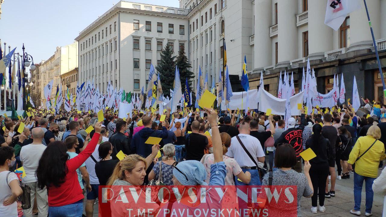 В руках собравшиеся под ОПУ держат желтые карточки как последнее предупреждение президенту Владимиру Зеленскому.