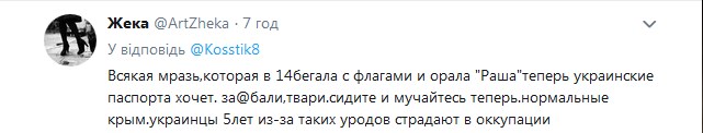 Другие пользователи сети его поддержали и выразили свое негодование желанием фанатов "Крымнаша" теперь воспользоваться преимуществом украинского гражданства.