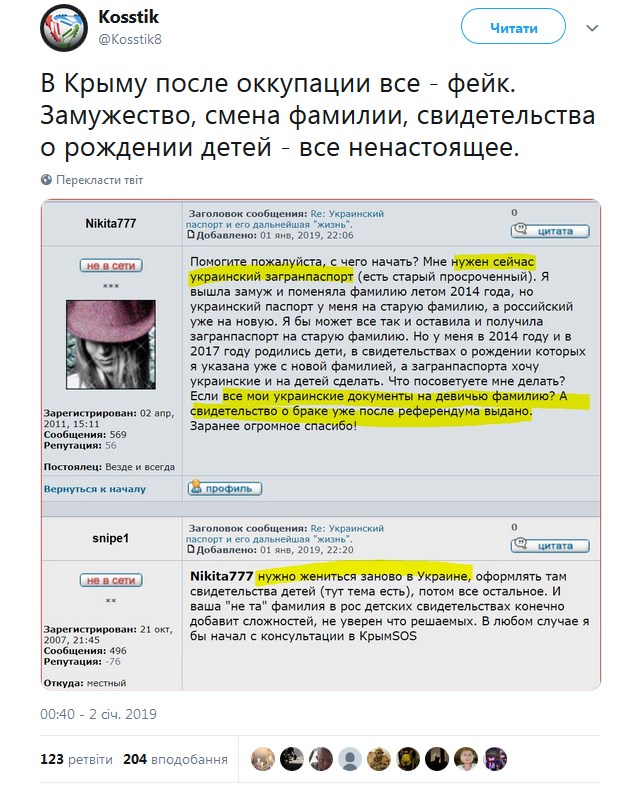 Так, на одном из форумов, пользователь под ником Nikita777 рассказала, что хочет получить для себя и своих детей украинский загранпаспорт (дающий право безвизового въезда в страны ЕС). Однако, как оказалось, после аннексии Крыма девушка вышла за муж и родила двоих детей.