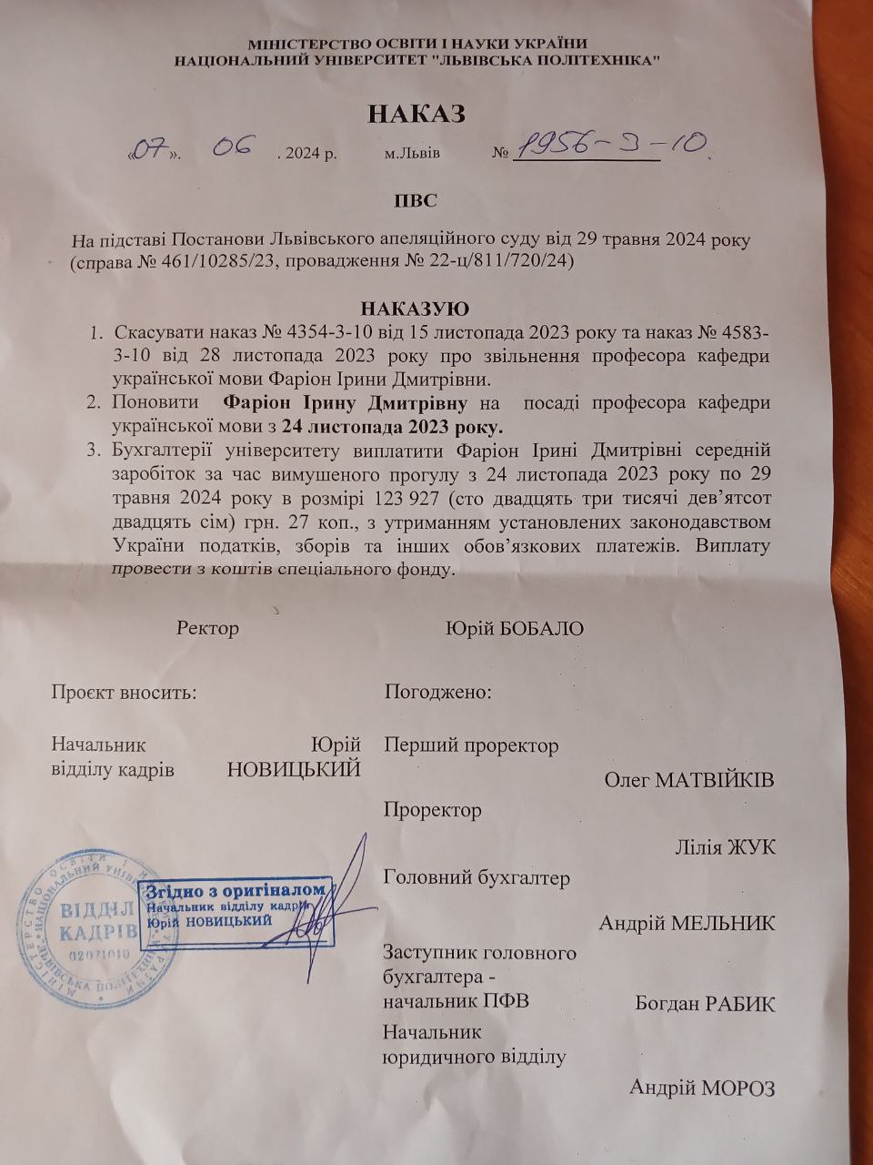 Соответствующие фото она опубликовала в своем Telegram-канале, в частности добавив приказ о восстановлении ректора университета Юрия Бобала. Кроме восстановления в документе указано, что Фарион также должны выплатить 123 927 гривен за, как говорится в приказе, "вынужденный прогул" в период с 24 ноября 2023 года по 29 мая 2024 года.