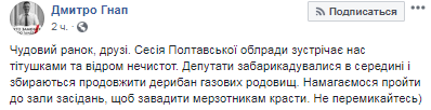 Напомним, что инцидент произошел поселке городского типа Шишаки в Полтавской области. Туда, на сессию облсовета, где депутаты будут утверждать выдачу лицензий на газодобычу, приехал журналист Дмитрий Гнап.