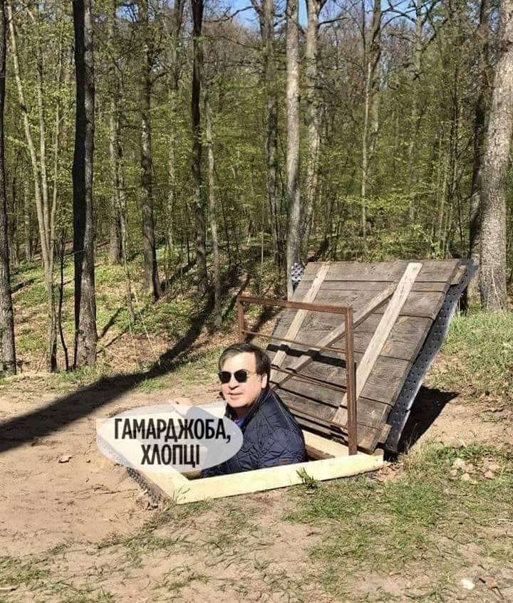 На нем изображен Саакашвили, который вылезает из погреба, как будто возникает из-под земли.