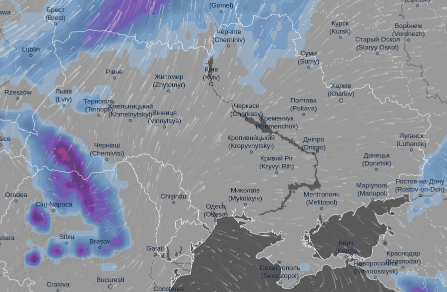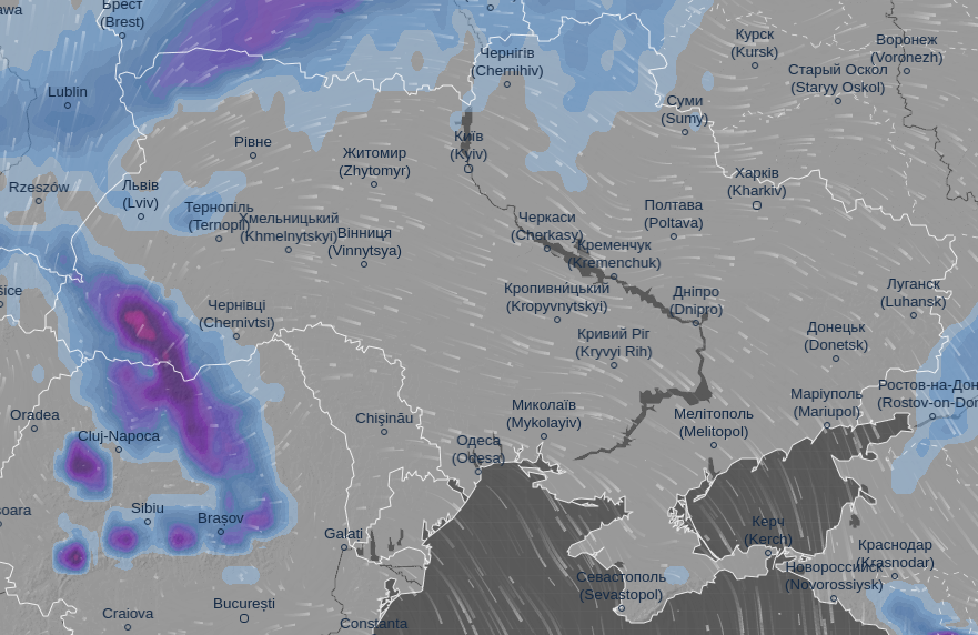 Об этом свидетельствуют данные погодной карты Ventusky.