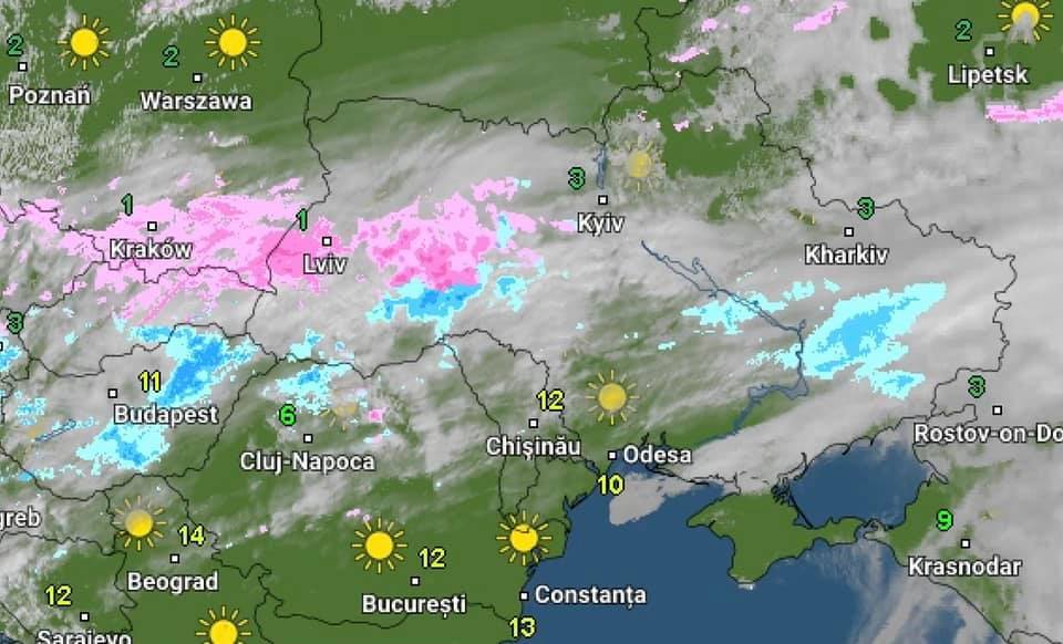 Как свидетельствуют опубликованные карты, осадки в виде снега (позначены розовым цветом) уже начались в западных и центральных областях Украины.