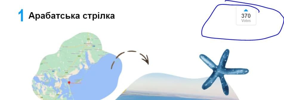 Читатели могут проголосовать за различные места отдыха на побережье Черного и Азовского морей. Пока лидирует Арабатская стрелка с 371 голосом. На последних местах - Приморское и Приморский посад, у которых меньше 10 голосов.