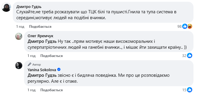 В то же время пользователь Дмитрий Гудзь прокомментировал это так: "Слушайте, не надо рассказывать что ТЦК белые и пушистые. Гнилая и тупая система внутри, мотивирует людей на подобные поступки".
