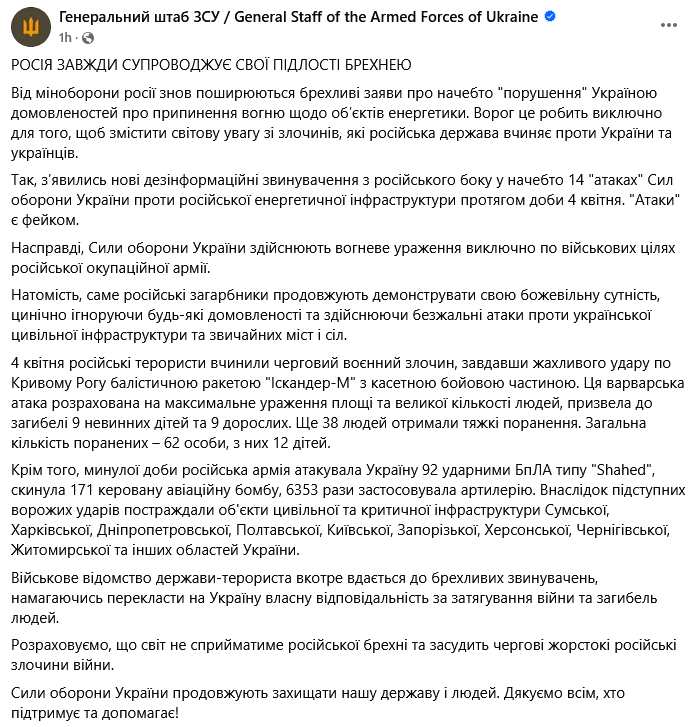 В Генштабе отметили, что 4 апреля террористы РФ совершили очередное военное преступление, нанеся удар по Кривому Рогу баллистической ракетой "Искандер-М" с кассетной боевой частью, чтобы максимально поразить площадь и было больше жертв. Также россияне атаковали Украину 92 ударными дронами типа "Shahed", сбросили 171 управляемую авиабомбу, более 6 тысяч раз применяли артиллерию. Пострадали объекты гражданской и критической инфраструктуры Сумской, Харьковской, Днепропетровской, Полтавской, Киевской, Запорожской, Херсонской, Черниговской, Житомирской области и других регионов.