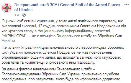 "Оценочные субъективные суждения, в том числе политического характера, высказанные сегодня, 12 декабря, полковником Алексеем Ноздрачев во время круглого стола в Национальном информационном агентстве "Укринформ" - не есть позицией Генерального штаба и Вооруженных Сил Украины", - говорится в сообщении.
