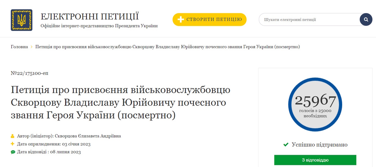 После гибели мужа Елизавета создала на сайте президента Украины петицию с просьбой присвоить ему посмертно звание "Герой Украины" - петиция набрала нужное количество голосов.