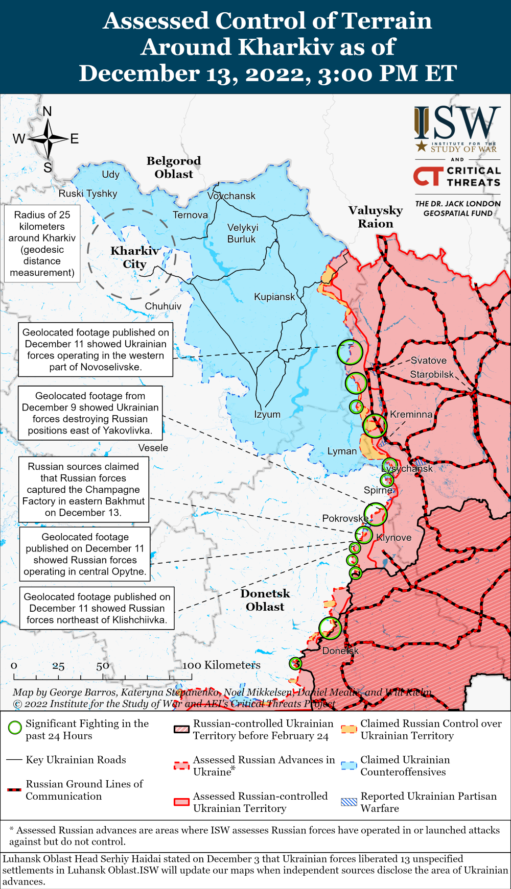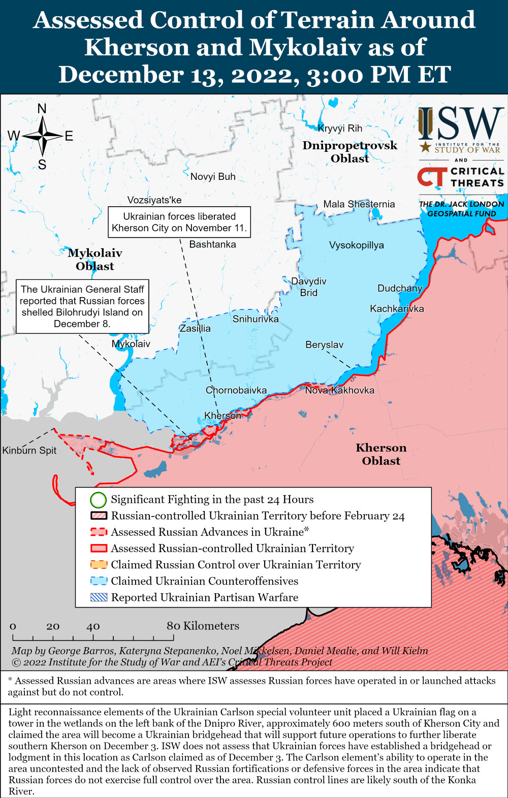 Продолжается полномасштабная война с российскими оккупантами, в минувшие сутки, 13 декабря, россияне продолжали ограниченные атаки в Донецкой области, оборонялись на Луганщине и укреплялись в Херсонской области. Подозрительная активность вражеских войск наблюдается также и в Беларуси.