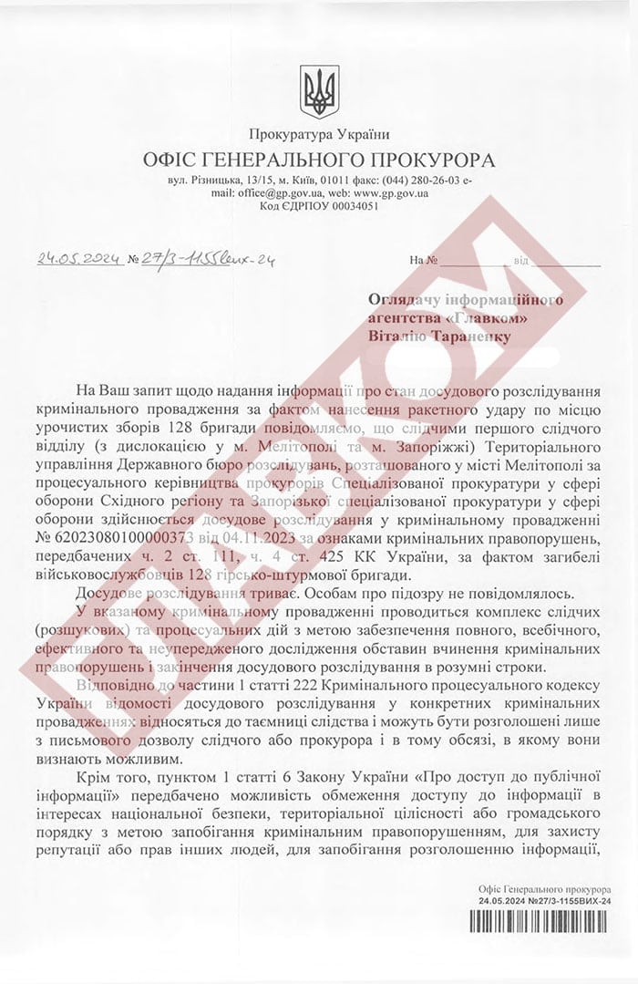 Об этом говорится в ответе Офиса генпрокурора на информзапрос издания "Главком".