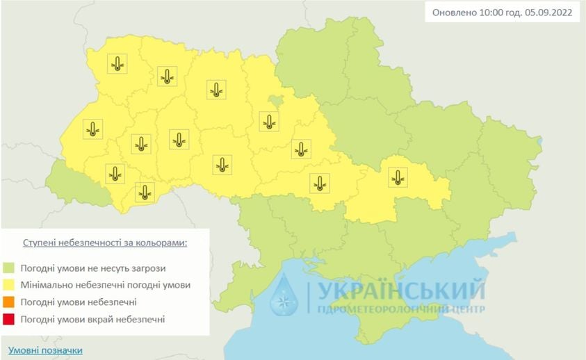 "Ночью 6-8 сентября в Украине, кроме Закарпатья и южной части, на поверхности почвы заморозки 0-5 градусов - I уровень опасности, желтый; в северо-восточных и восточных областях и в воздухе 0-3 градусов – II уровень опасности, оранжевый", - сказано в предупреждении синоптиков.