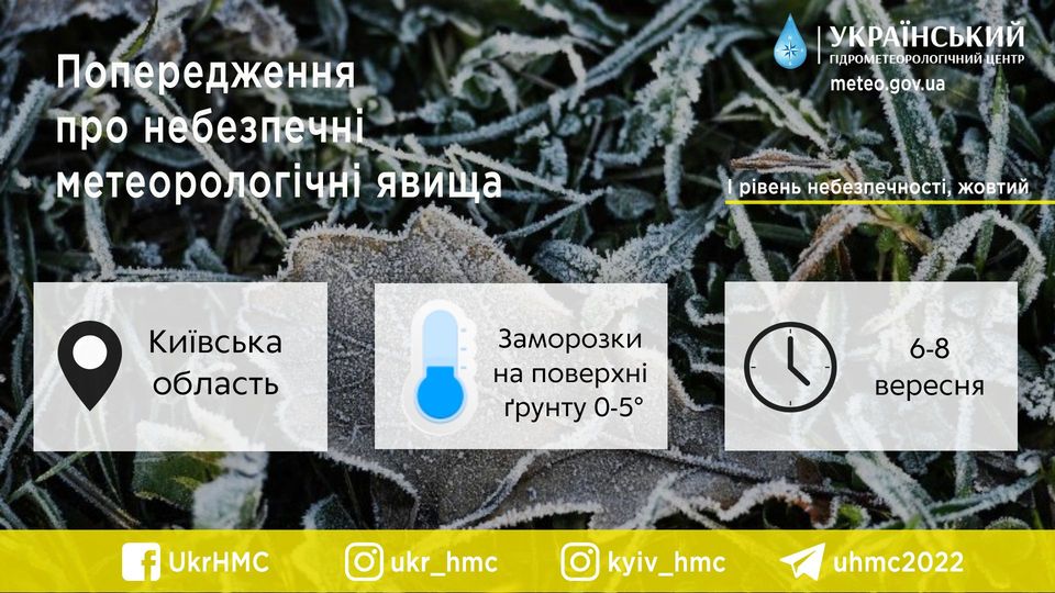 Уточняется, что понижение температуры может затронуть и Киевскую область, где 6-8 сентября на поверхности грунта вероятны заморозки 0-5 градусов.