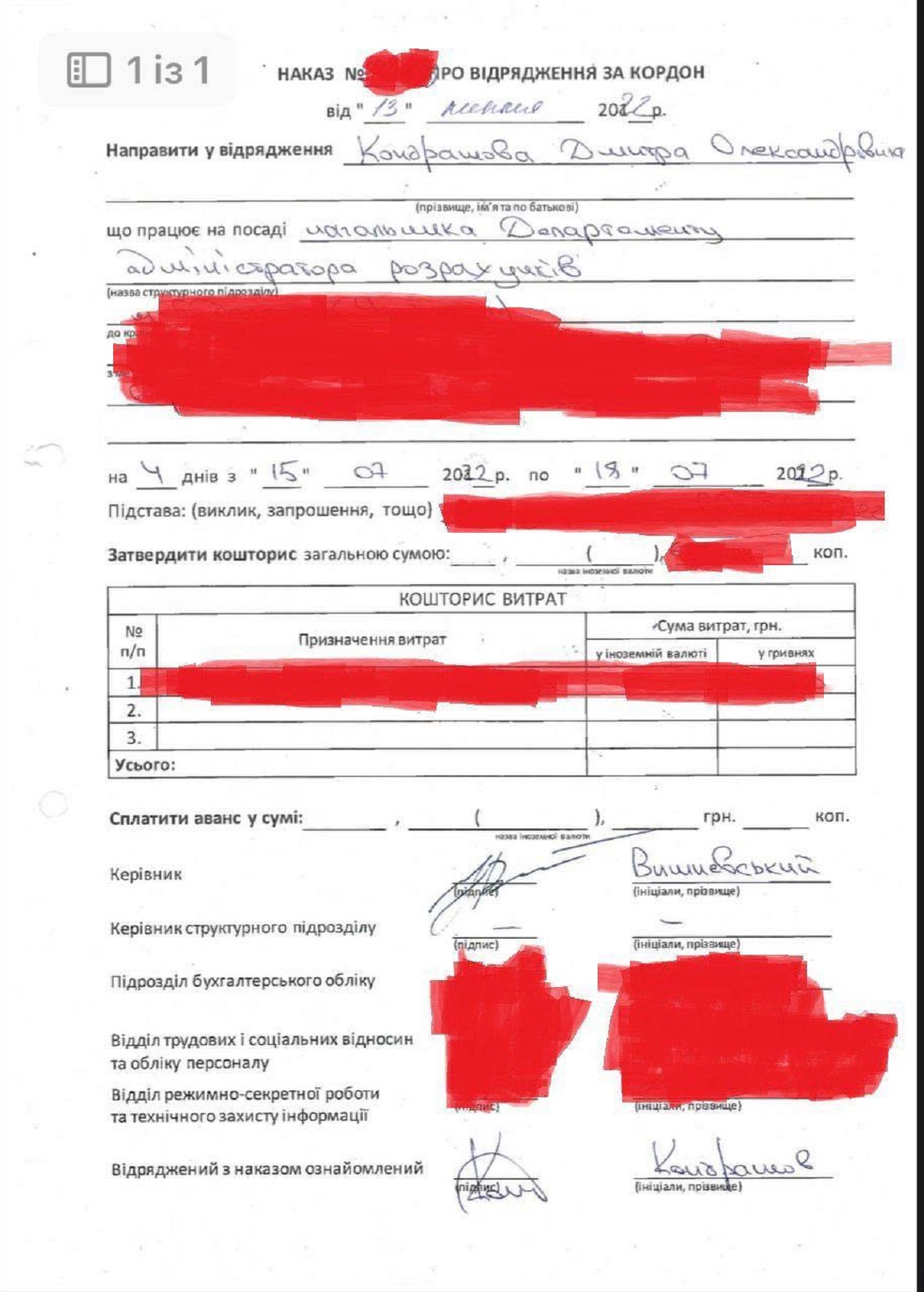 Загородний опубликовал копии приказов. Вишневский уехал в Польшу 26 февраля 2023 года, Кондрашов – в Венгрию 15 июля 2022 по основанию "служебная командировка".