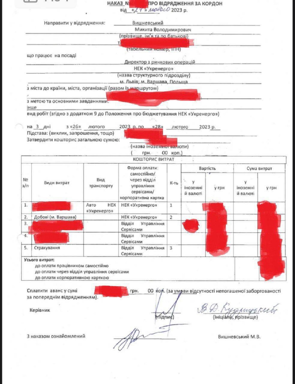 Вишневский поехал в командировку уже во время расследования с разрешения руководителя Укрэнерго Владимира Кудрицкого – он подписал приказ.