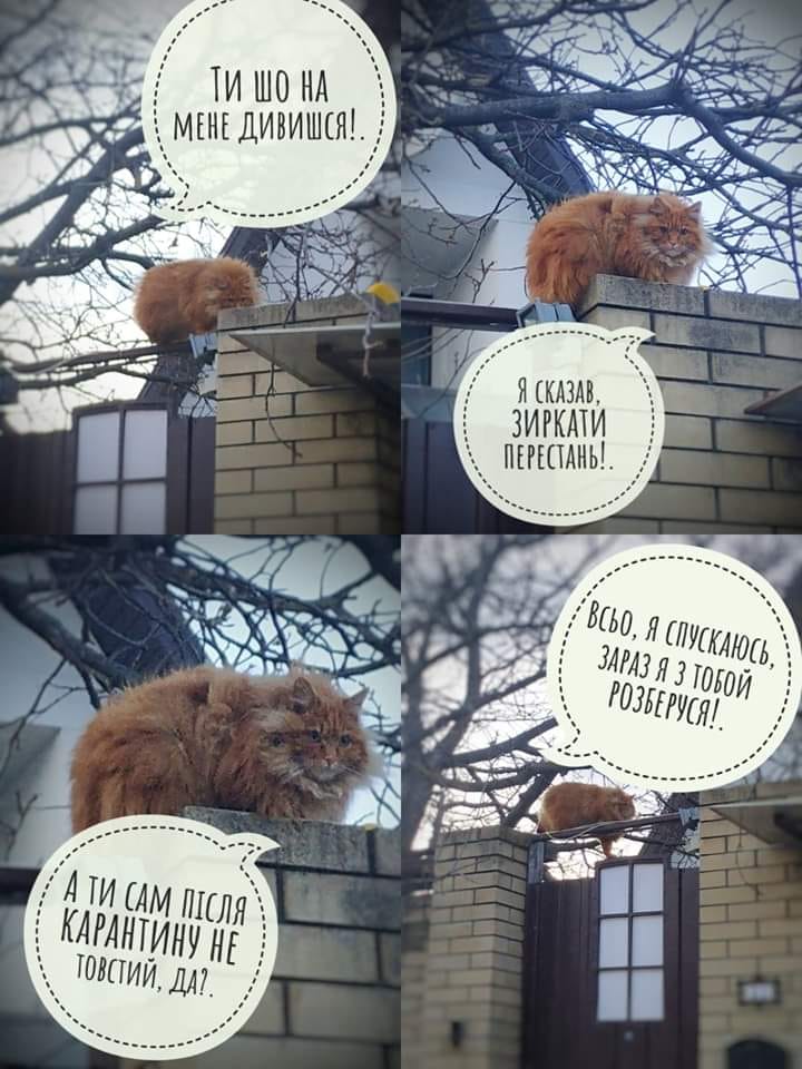 На фото – толстый рыжий кот, сидящий на заборе. Подпись под фото: "Ты что на меня смотришь? А ты сам после карантина не толстый, да?".