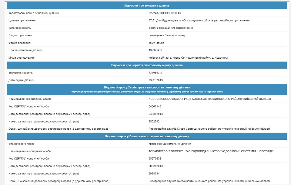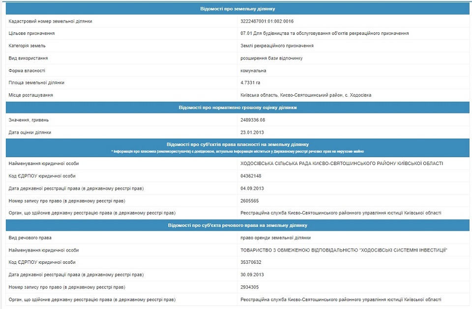 По данным СМИ, история участков началась в 2004, когда два надела - 3222487001:01:002:0013 и 3222487001:01:002:0016 - на 19 га для строительства рекреационного комплекса на берегу озера взяло в аренду ООО "Топаз-электроникс".