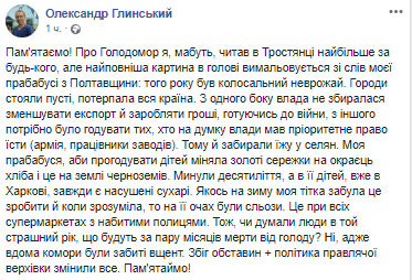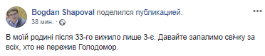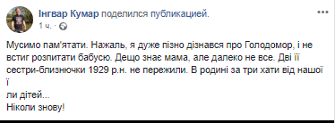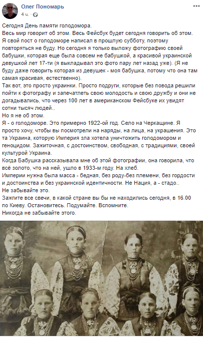 "Я - о голодоморе. Это примерно 1922-ой год. Село на Черкащине. Я просто хочу, чтобы вы посмотрели на наряды, на лица, на украшения. Это та Украина, которую Империя зла хотела уничтожить голодомором и геноцидом. Зажиточная, с достоинством, свободная, с традициями, своей культурой Украина. Когда Бабушка рассказывала мне об этой фотографии, она говорила, что все золото, что на ней, ушло в 1933-м году. На хлеб. Империи нужна была масса - бедная, без роду-без племени, без гордости и достоинства и без украинской идентичности. Не Нация, а - стадо. Не забывайте это. Зажгите все свечи, в какой стране вы бы не находились сегодня, в 16.00 по Киеву. Остановитесь. Подумайте. Вспомните. Никогда не забывайте этого", - написал в Facebook блогер Олег Пономарь.