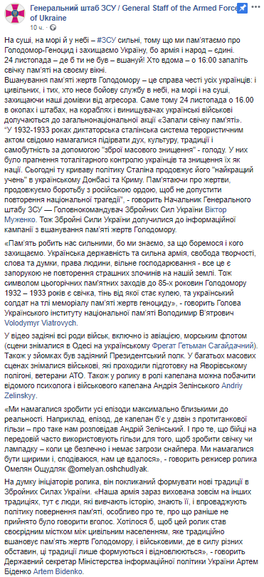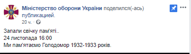 "Памяти жертв Голодомора - это дело чести всех украинцев: и гражданских, и тех, кто несет боевую службу в небе, на море и на суше, защищая наши дома от агрессора. Именно поэтому 24 ноября в 16.00 в окопах и штабах, на кораблях и истребителях украинские военные приобщаются к общенациональной акции "Зажги свечу памяти", - написали в пресс-службе ВСУ.