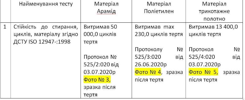 Следующий тест, который был проведен НПП "Темп-3000", это устойчивость к истиранию материалов. Тест подтверждает срок службы бронежилетов - 5 лет и материалы, из которых они изготовлены, должны выдерживать не менее 50 тыс циклов трения. Однако баллистический сверхвысокомолекулярный полиэтилен (СВМПЭ) согласно протоколу выдержал разрушение верхней пленки максимум за 100 циклов трения, а внутренний слой разрушился на 230 цикле. Такие характеристики связаны с его изготовлением, поскольку верхняя и нижняя пленка имеет толщину до 10 микрон, поэтому быстро повреждается, а затем рассыпаются клееные волокна полиэтилена.