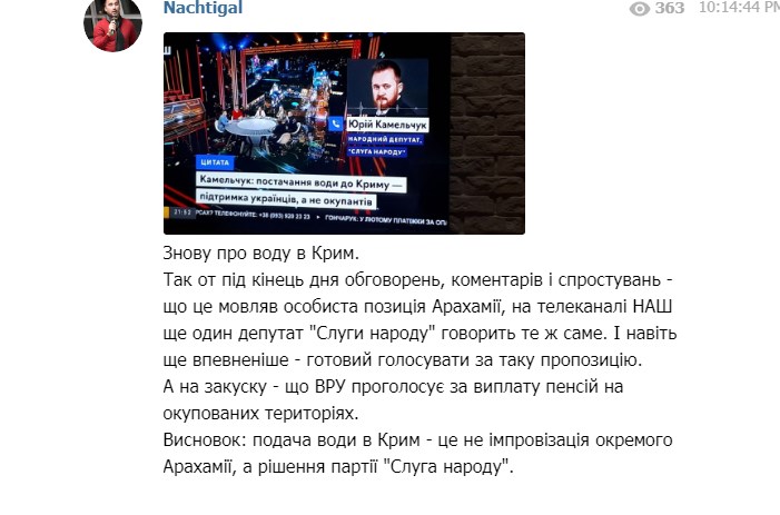 "На телеканале "НАШ" еще один депутат "Слуги народа" говорит то же самое. И даже еще более уверенно - готов голосовать за такое предложение. Вывод: подача воды в Крым - это не импровизация отдельного Арахамии, а решение партии "Слуга народа", - комментируют заявление нардепа в Telegram-канале "Nachtigal".