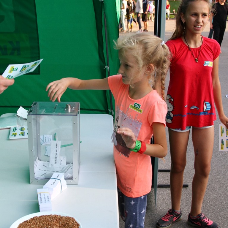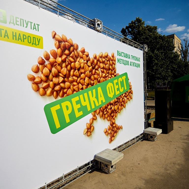 Выставка грязных предвыборных технологий ГречкаФест состоялась в Днепре, посетителям фестиваля предлагалось символически обменять голос на гречку, в тире дротиками лопнуть воздушные шары "пустых обещаний", а также стать клоном кандидата от "Слуги народа" на стенде с партийным бордом.