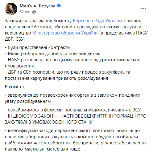 Кроме того, решено интесифицировать меры парламентского контроля по другим направлениям оборонных закупок и нардепы будут разбираться в ближайшее время, как покупают вооружение, боеприпасы, вещевое обеспечение, горюче-смазочные материалы и т.д., отметила Марьяна Безуглая.