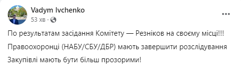 "Резников на своем месте, правоохранители должны завершить расследование", - написал народный избранник после заседания Оборонного комитета Рады, где рассматривали сандальную закупку продуктов для военных.