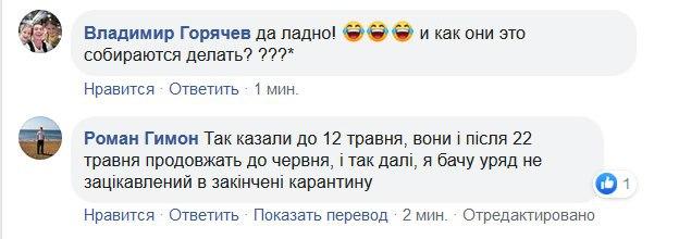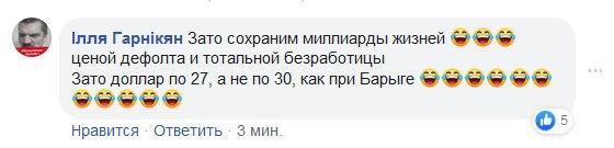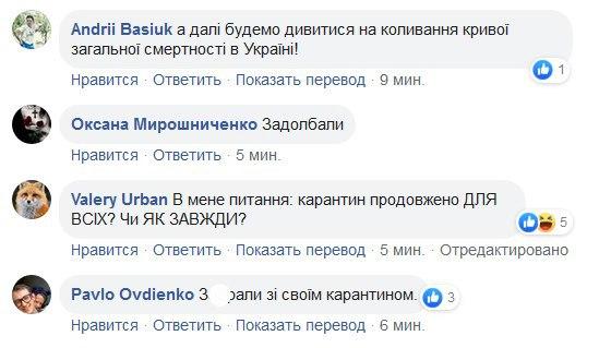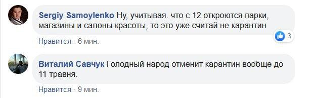 "Голодный народ отменит карантин вообще до 11 мая", "Ну, учитывая, что с 12 откроются парки, магазины и салоны красоты, то это уже считай не карантин", "Зато сохраним миллиарды жизней ценой дефолта и тотальной безработицы. Зато доллар по 27, а не по 30, как при Барыге", "А людям за что жить", "Еще не весь малый и средний бизнес добили. Подумаешь всего-то 40% ликвидировались. Не порядок, надо продлевать", - пишут в сети.