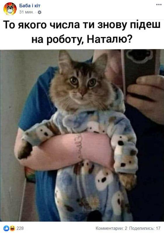 В одном из сообществ в Facebook появилась фотожаба, на ней изображена девушка с котом на руках, они делают селфи в зеркале. Хозяйка со скуки одела животное в детский комбинезон. И сверху над фото надпись: то какого числа ты опять пойдешь на работу, Наталья?